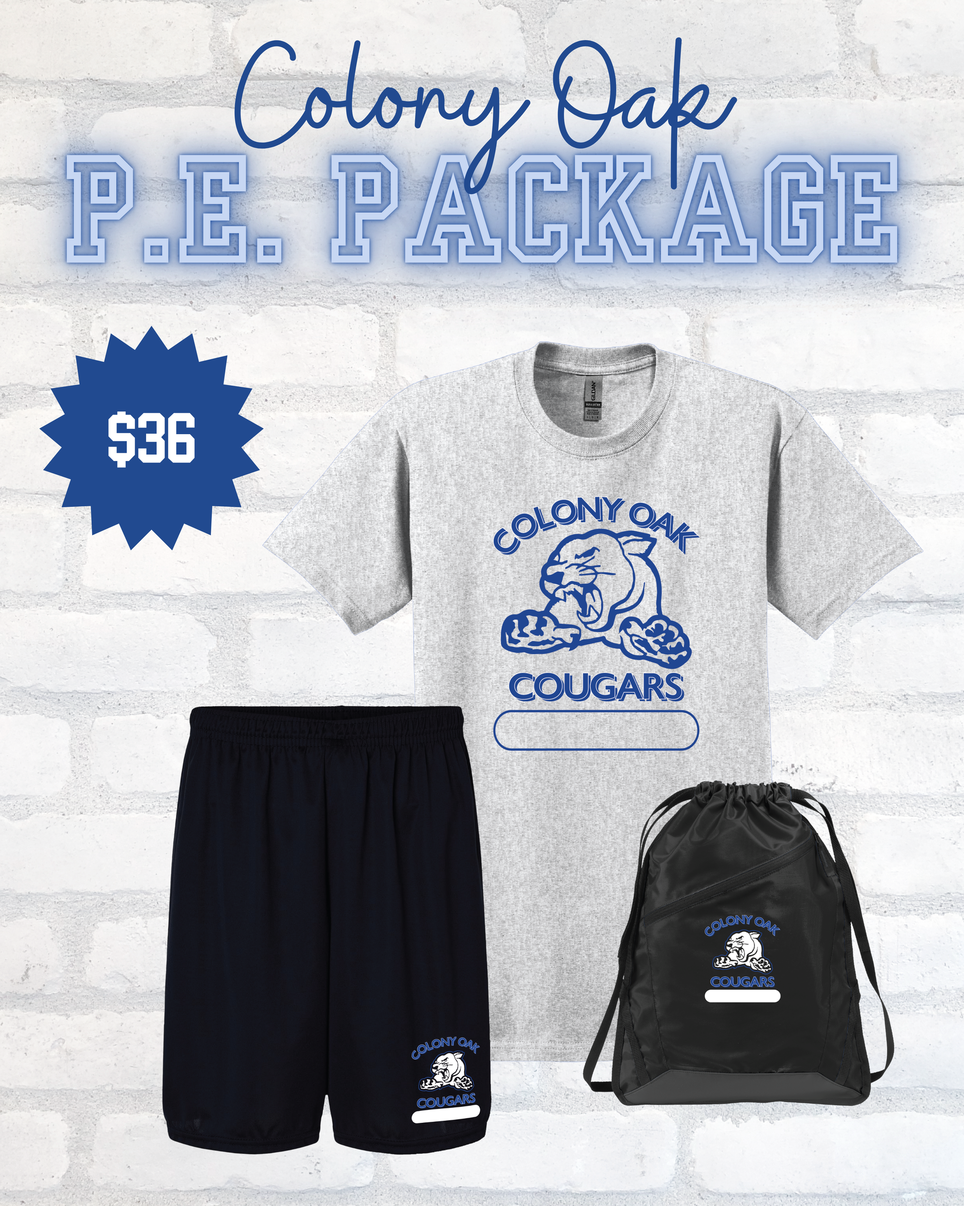 Package includes 1 PE shirt, 1 pair of PE shorts, and 1 draw string backpack at a more discounted price than each item would be individually.