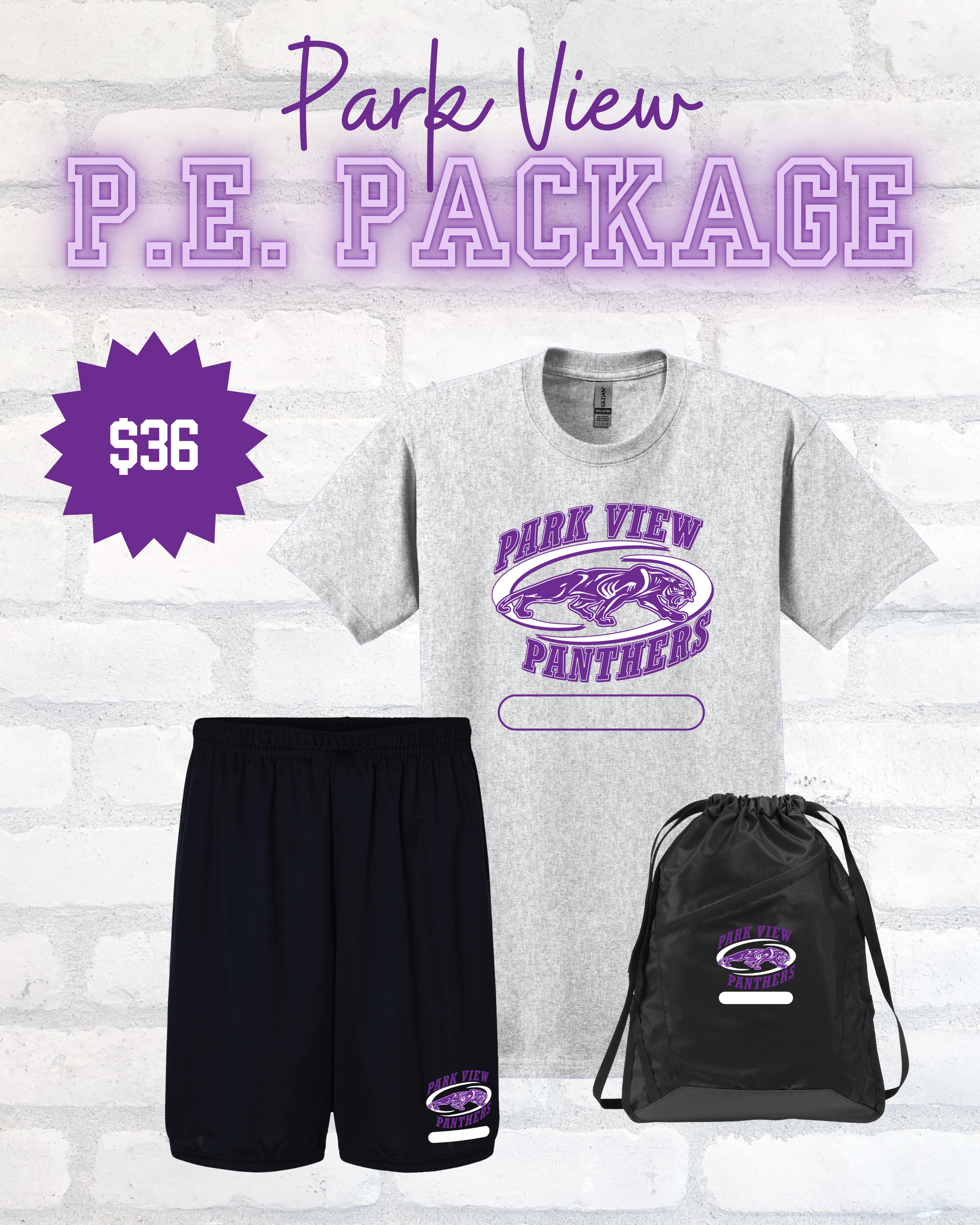 Package includes 1 PE shirt, 1 pair of PE shorts, and 1 draw string backpack at a more discounted price than each item would be individually.
