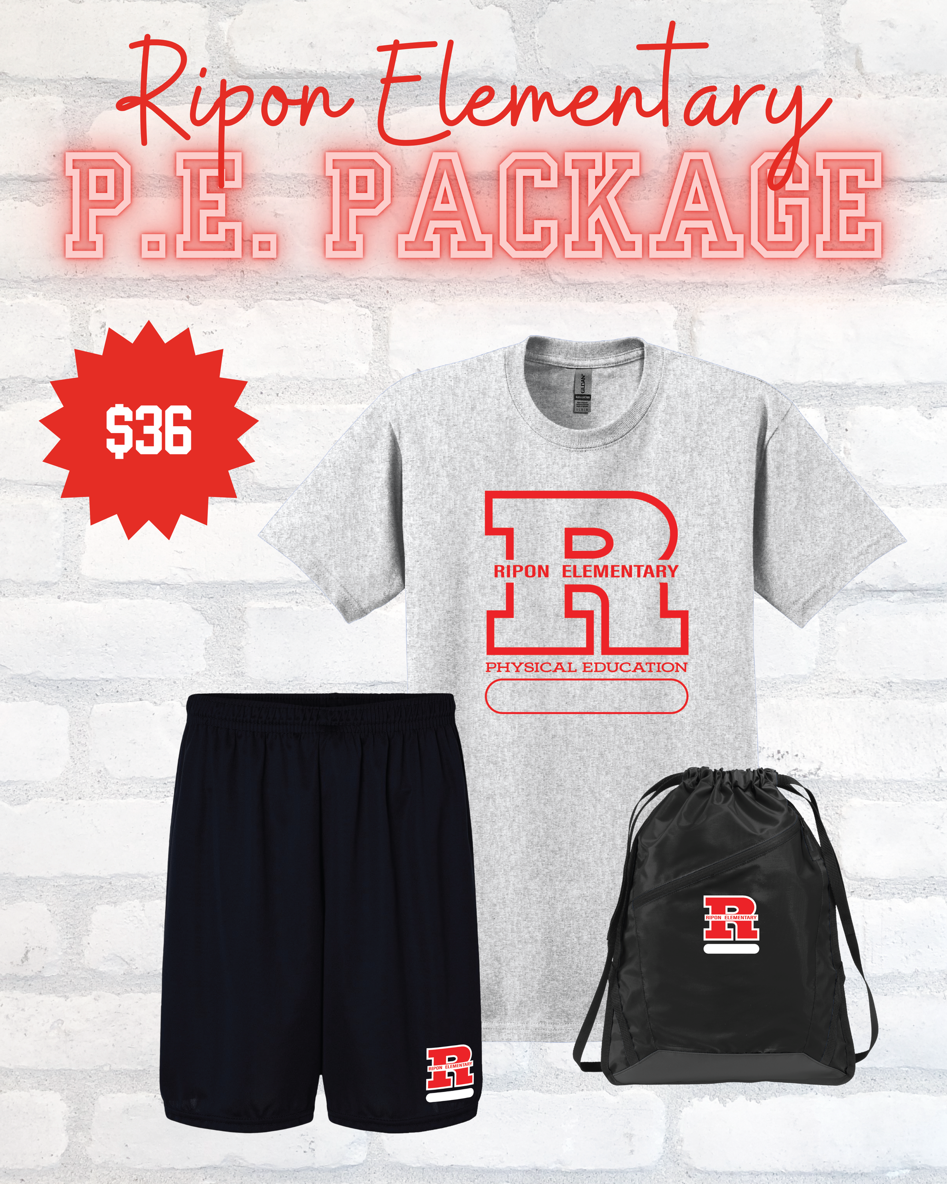 Package includes 1 PE shirt, 1 pair of PE shorts, and 1 draw string backpack at a more discounted price than each item would be individually.